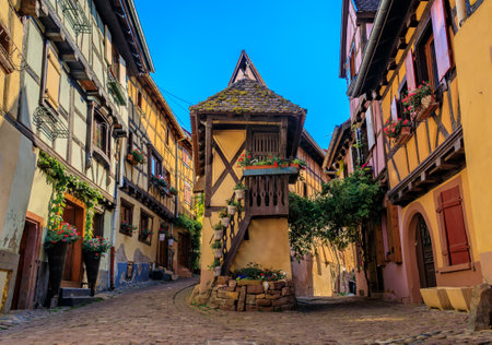 Picturesque street with traditional colorful houses in Riquewihr village on alsatian wine route, Alsace, France