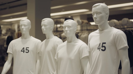 Rows of white green and blue shirts hang on metal racks with black hangers in a brightly lit industrial setting. The shirts are neatly arranged in parallel lines extending into the distance. The background shows a clean, modern factory or warehouse environment with overhead lighting and some machinery visible.