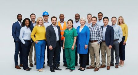 A diverse group of professionals from various fields stand together, symbolizing unity, collaboration, and the strength of a diverse workforce. Isolated on white background.