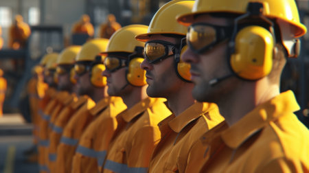 Professional construction workers wearing yellow helmets and bright uniforms stand confidently at an industrial site, showcasing teamwork and dedication in their roles.