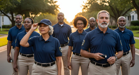 A diverse group of male and female volunteer patrol officers stand in formation on a suburban street at sunset. Wearing blue uniforms, they look ahead with a sense of duty and determination, representing community safety and neighborhood watch.