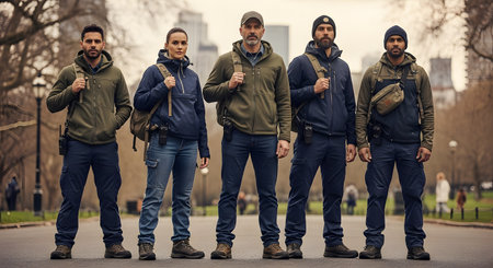 A diverse team of five people, four men and one woman, stand together with confident expressions in a city park. They are dressed in coordinated tactical and outdoor apparel, including fleece jackets, cargo pants, and backpacks. The group portrait conveys a sense of unity, readiness, security, and preparedness for an adventure or mission.