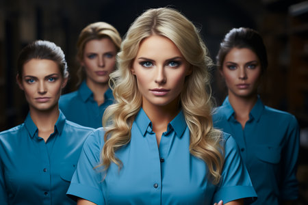 Five confident multiethnic professionals wearing matching work jumpsuits stand together with serious expressions, symbolizing teamwork and a unified purpose.