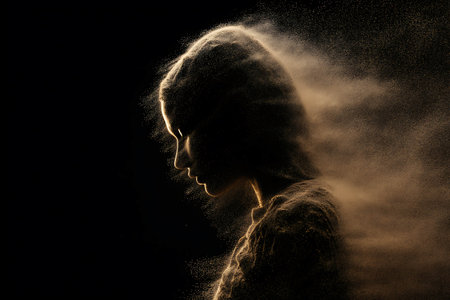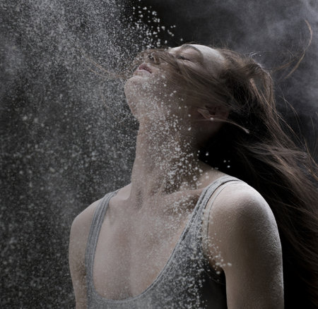 Woman with dark hair in a dark room and flying white powder around