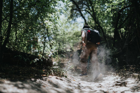 Person hiking through forest trail with backpack in summer. Outdoor adventure activity, nature exploration, and physical fitness