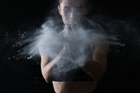 Woman clapping hands with powder before training on black background
