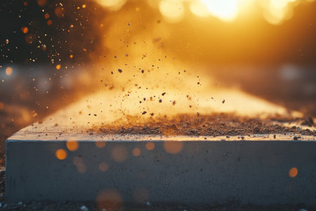 Golden hour close up of fresh concrete base at construction site with dust and dirt in the air