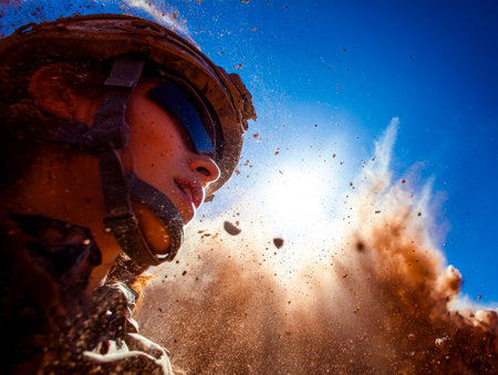 An adventurer wearing safety gear navigates a rugged terrain, kicked-up dust and stones swirling beneath a vivid azure sky, evoking thrill and resiliency