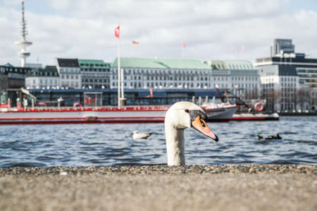 head of a swan coming up behind quay wall at Alster Lake in Hamburg, Germany