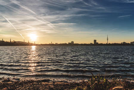 Beautiful panoramic view of Alster river and Hamburg town hall - Rathaus at spring earning evening during golden hour