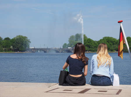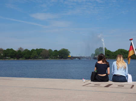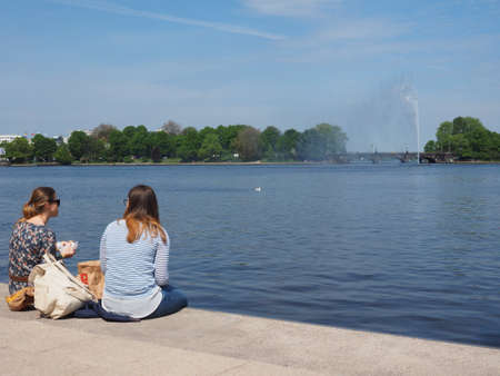 HAMBURG, GERMANY - CIRCA MAY 2017: People on Binnenalster (meaning Inner Alster lake) bank