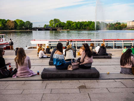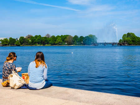 HAMBURG, GERMANY - CIRCA MAY 2017: People on Binnenalster (meaning Inner Alster lake) bank, hdr
