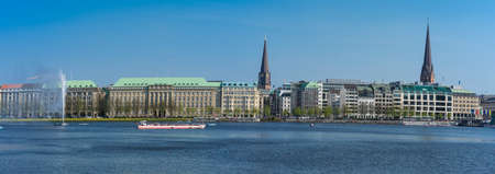 Hamburg, Germany - August 23, 2019: Panoramic view of Lake Binnenalster in Jungfernstieg, an urban promenade in Neustadt, Hamburg, Germany
