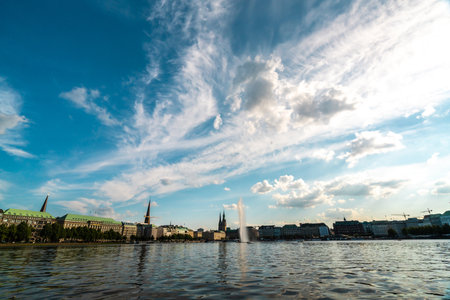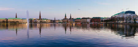 Beautiful panoramic view Alster lake with fountain