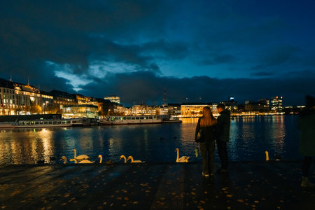 Hamburg city center view at night in Germany. Swans on the water. High quality photo