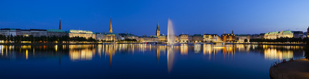 Panoramic shot of the famous Binnenalster lake with its fountain in Hamburg, Germany at night