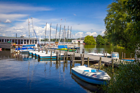 Hamburg, Germany - June 26, 2014: Waterfront of Aussenalster Lake in Hamburg city. Lake and shores are used by Hamburg inhabitants for many sport and recreational purposes, such as sailing and rowing