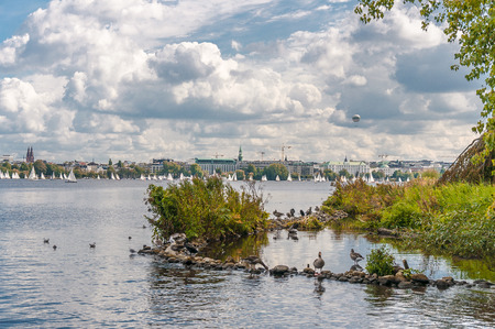 waterbirds on Alster Lake in Hamburg, Germany against cityscape and blue sky on sunny day