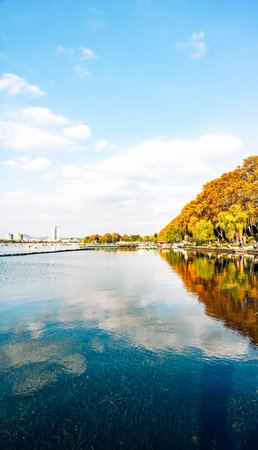 City lake view with rain clouds. View of the habitat of ducks.