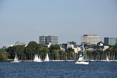 Hamburg lake Aussenalster with sailing boats - skyline of Hamburg city