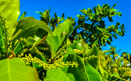 Nuts seeds leaves on tropical tree Terminalia catappa sea almon in Playa del Carmen Mexico.