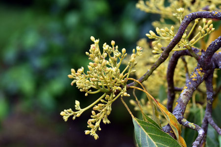 Yellow leaves and flowers of the avocado tree (Persea Americana)
