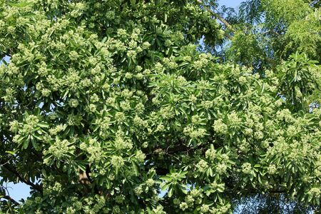 Lithocarpus edulis flowers and acorns. Fagaceae evergreen tree. Flowers (monoecious) bloom in summer and the acorns ripen in the following autumn and are edible.