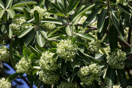 Shrubs and trees Pittosporum in Montenegro. Landscaping design of the hotel.