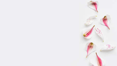 Banner with fragile flower petals and copy space. Pink Alstroemeria petals scattering on white background. Top view, flat lay.