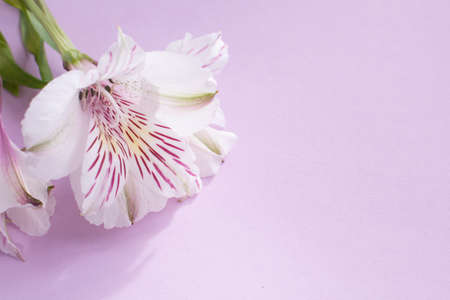 White and pink flower Alstroemeria on a pink background with copyspace