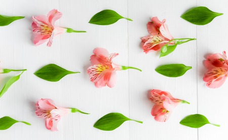 Pattern of natural flowers Alstroemeria on a white wooden background. Floral pattern. Pink and white flowers of Alstroemeria on a white background. Flat lay, top view.