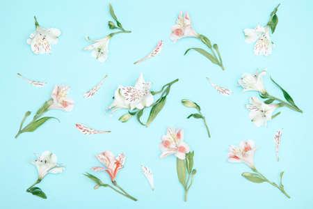 Floral pattern made of white and pink alstroemeria flowers on pastel blue background. Nature concept. Top view. Flat lay