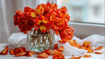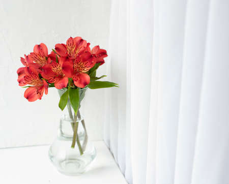 Bouquet of red alstroemeria in a glass vase on a white windowsill with a white curtain.