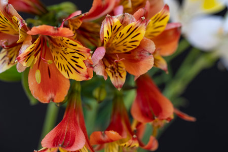 Alstroemeria flowers Red and white colors bouquet on dark background. Close up. Copy space