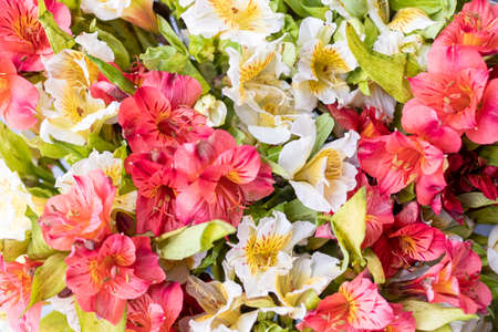 Bouquet of red flowers Alstroemeria. Close-up. Selective focus
