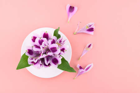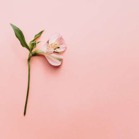 Alstroemeria flower on pink background. Delicate pink flower. Flat lay. Copy space.