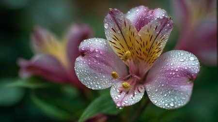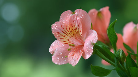 Delicate pink alstroemeria flower adorned with water droplets, on green background.