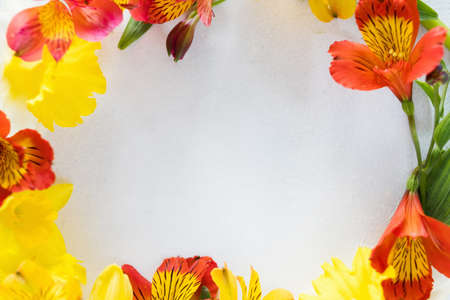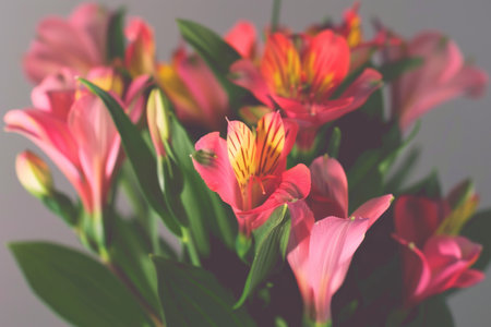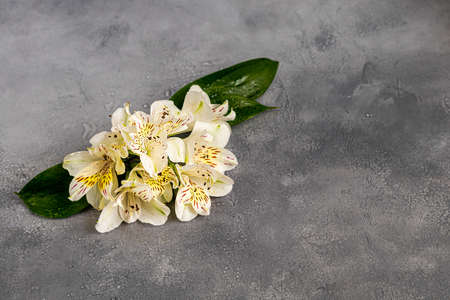 Beautiful alstroemeria flowers on the grey colored background. Space for text.