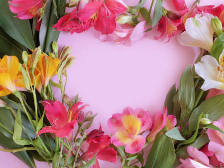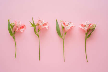 top view of tropical alstroemeria flowers on pink background