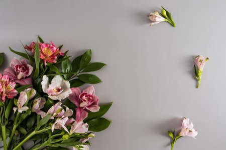 a bouquet of beautiful flowers and buds alstroemerieae on a gray background with an empty space for text. top view. flat lay