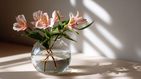 A beautiful arrangement of delicate Alstroemeria flowers in a clear glass vase, illuminated by soft sunlight, casting graceful shadows on a wooden surface.