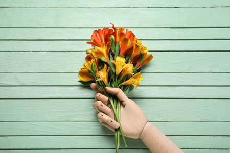 Wooden hand with beautiful alstroemeria flowers on color wooden background