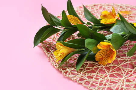Beautiful alstroemeria flowers, plant branches and wicker mat on pink background, closeup