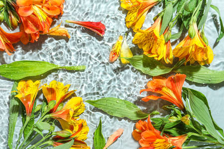 Different alstroemeria flowers in water on light background, closeup