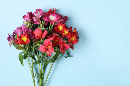 Bouquet of beautiful alstroemeria flowers on blue background, closeup