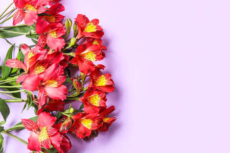 Beautiful alstroemeria flowers on lilac background, top view