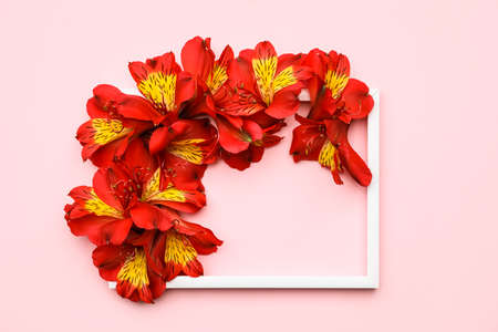 Composition with empty picture frame and alstroemeria flowers on pink background