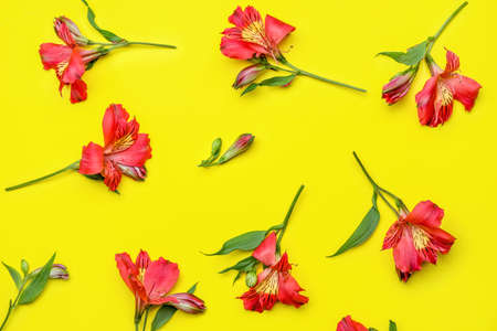Red alstroemeria flowers on yellow background