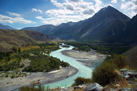mountain river in valley and majestic mountains, Altai, Russia