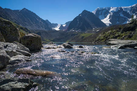 Mountain lake. Beautiful scenery. Blue lake in the highlands of Altai. Siberia Russia. A quiet rest at the lake with crystal clear water on the background of snowy peaks. mountains are reflected